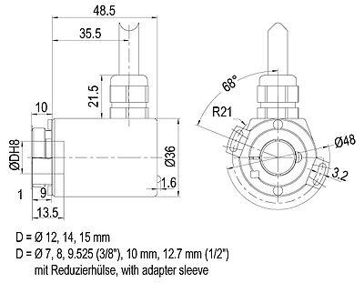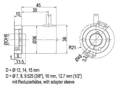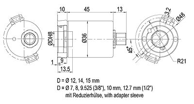 for hollow shaft encoder 36E with hollow shaft (blind) Ø 8 mm, Ø 10 mm, Ø 12 mm, Ø 14 mm, Ø 15 mm.